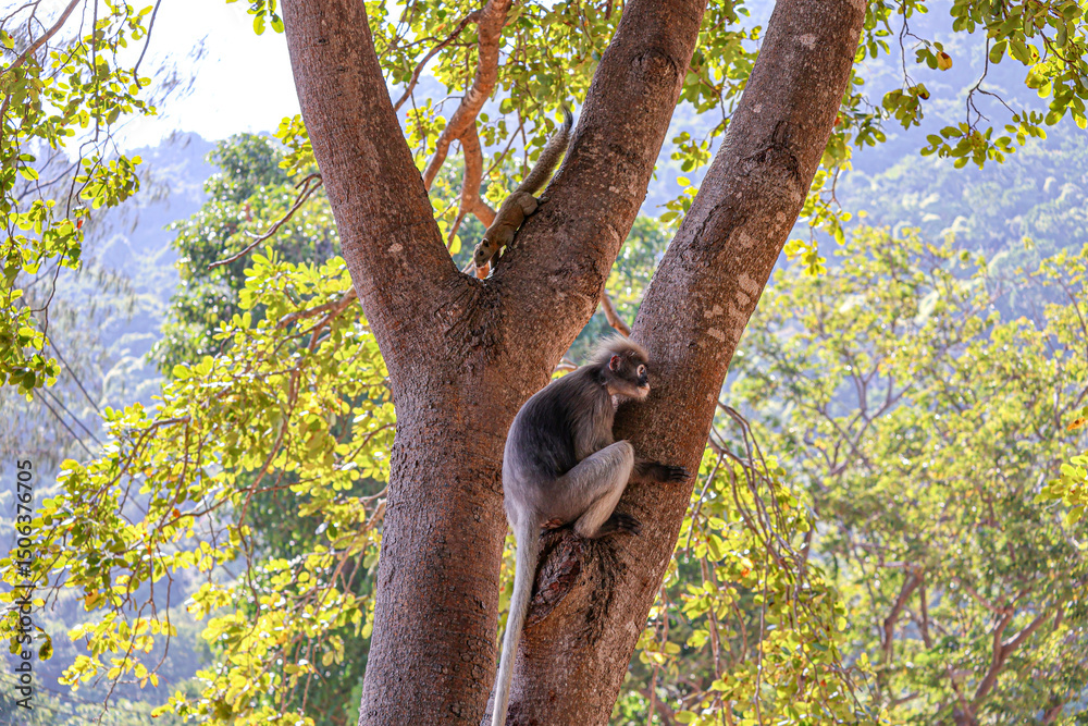 Dusky leaf monkey, spectacled langur and grey squirrel on a tree. Coexistence of animals of different species in nature