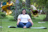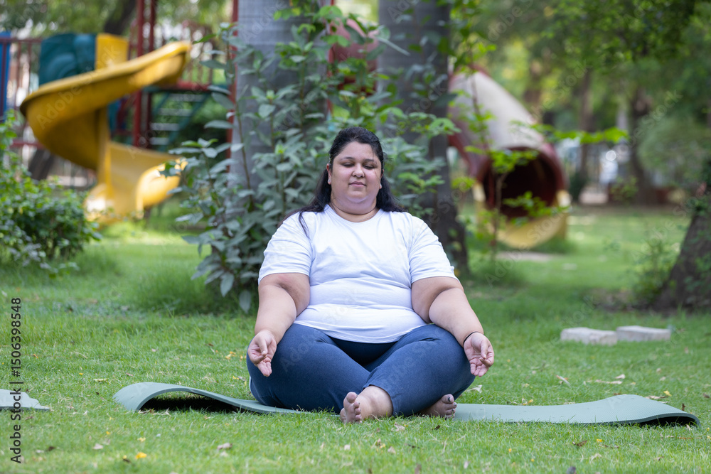 Indian woman do yoga meditation at summer park to loose weight and stress management. Plus size or fat man obesity problem. Mental health and fitness lifestyle. Balance life.