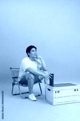 Young man in casual clothing sitting on a chair, enjoying a drink while thinking thoughtfully in a blue background setting