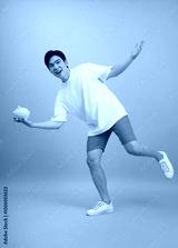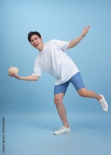 Young man joyfully holding a piggy bank while posing playfully against a light blue backdrop