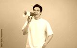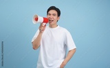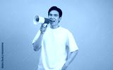 Energetic young man using a megaphone to engage with an audience in a bright blue studio