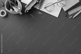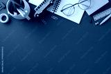 Flat lay of various school supplies on a green desk background emphasizing education and learning