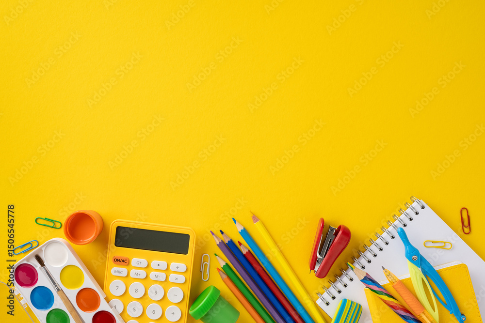 School supplies such as pencils, paint, and a calculator arranged on yellow background