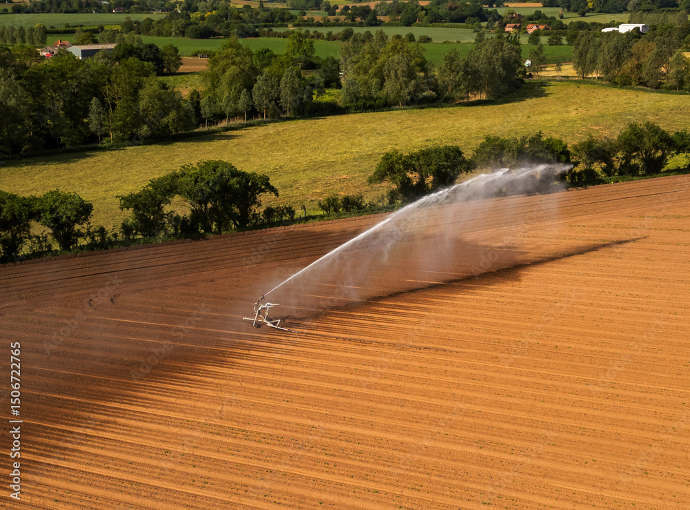 An aerial view of farmland being irrigated near Bures in Suffolk, UK