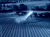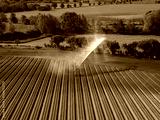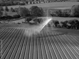 An aerial view of farmland being irrigated near Bures in Suffolk, UK