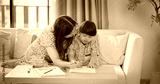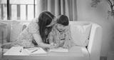 Asian Mother and young son with Down syndrome painting and drawing together on a sofa in the living room. Bonding moment of love, learning, support, and inclusive family education.