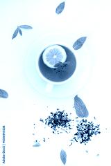 Fresh lemon wedges and cup of tea with mint and lemon, stylized on clean background image.