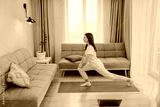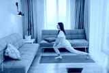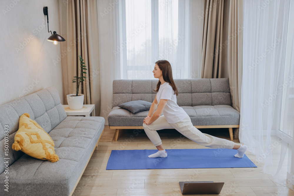 Young woman practicing yoga in her living room following online class on laptop