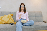 Young Woman Watching TV and Eating Popcorn on Sofa at Home