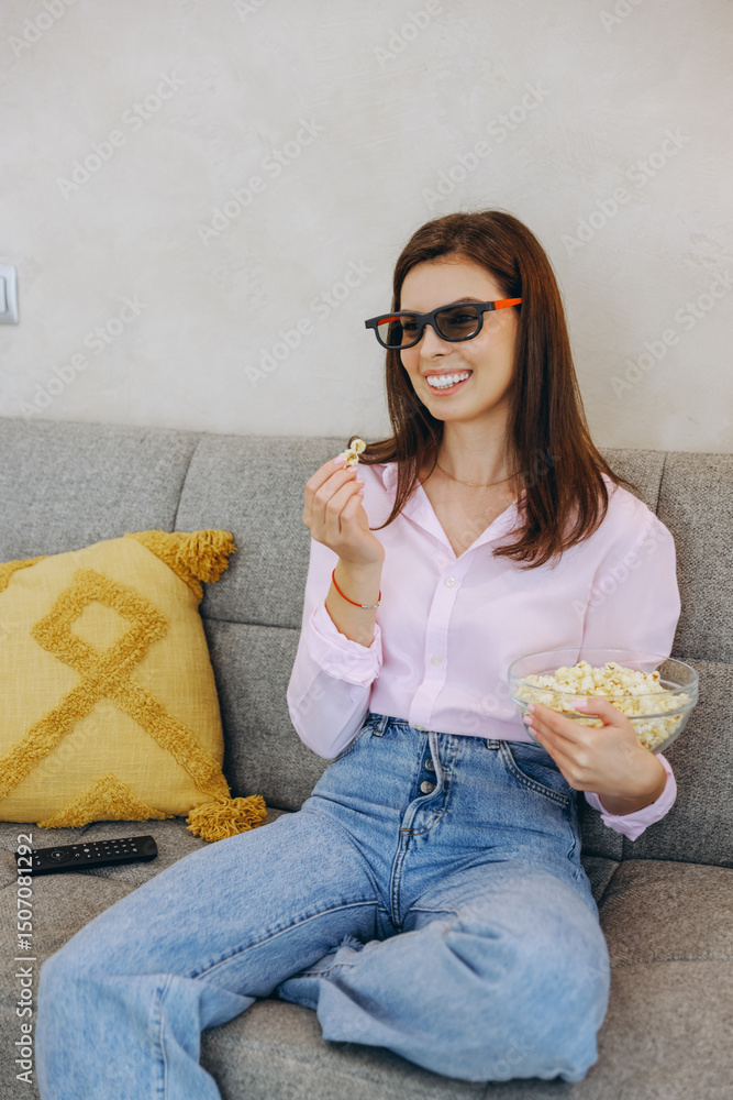 Young Woman Enjoying Movie with Popcorn and 3D Glasses at Home