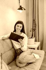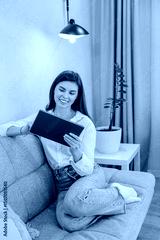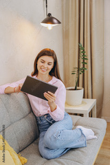 Young Woman Relaxing on Sofa Using Digital Tablet at Home