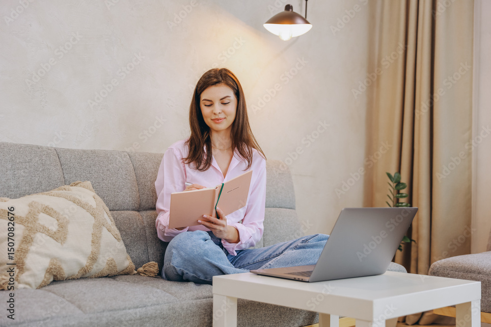 Young Woman Working From Home Sofa Taking Notes in Notebook with Laptop