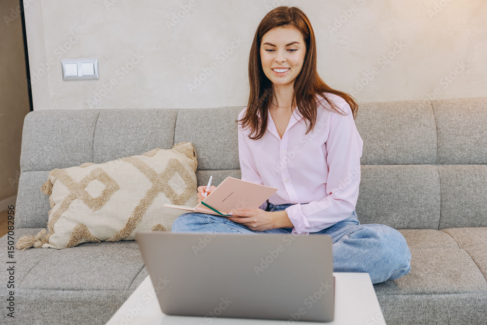 Young Woman Taking Notes While Watching Online Course on Laptop at Home