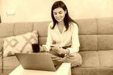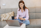Young Woman Working Remotely from Home Using Laptop and Smartphone While Enjoying Coffee