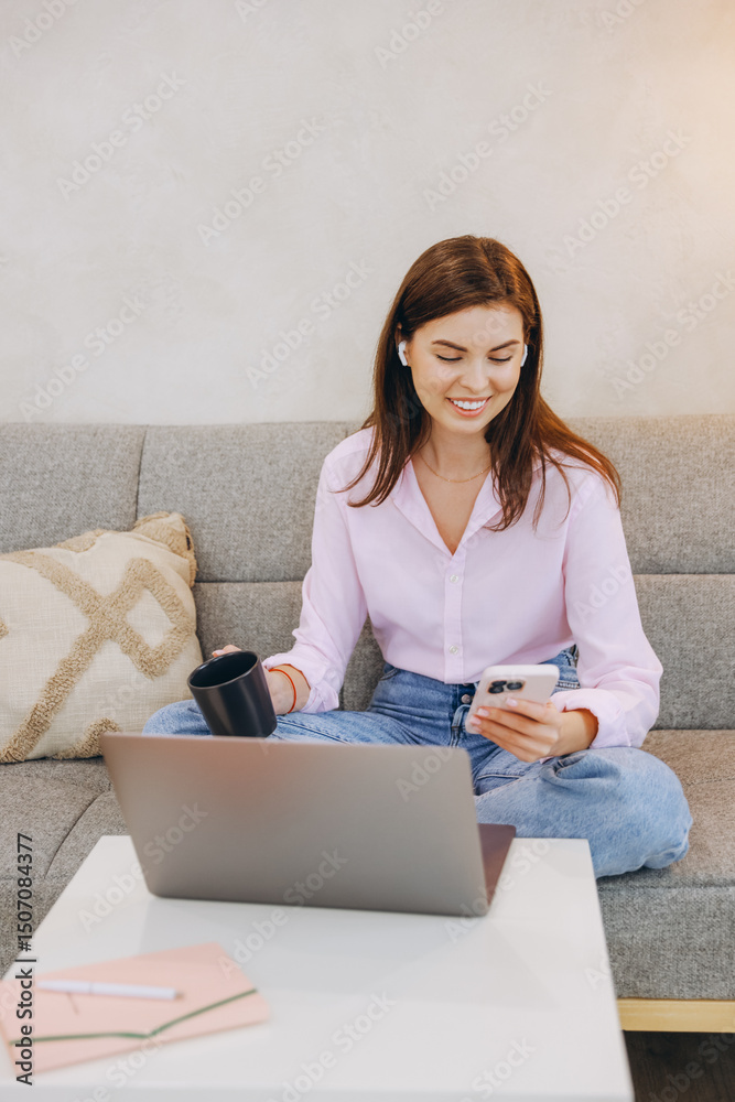 Young woman working from home using laptop and smartphone while drinking coffee
