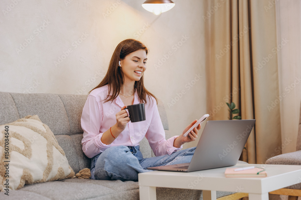 Young Woman Working Remotely from Home, Enjoying Coffee and Using Laptop