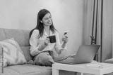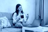 Young Woman Working Remotely from Home Using Laptop and Smartphone While Enjoying Coffee