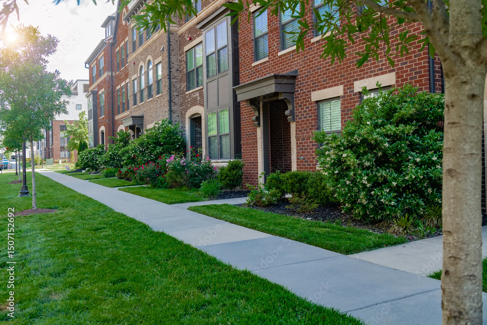 sidewalk along the rows of modern brick townhouses with landscaping.