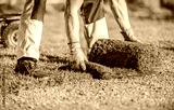 Laying Sod on a Residential Lawn in Bright Daylight With Workers Preparing the Ground