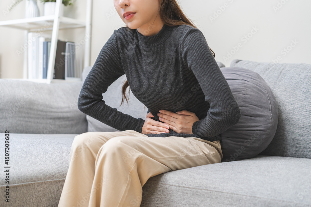 Flatulence ulcer, asian young woman, girl hands in belly, stomach pain from food poisoning, abdominal pain and digestive problem, gastritis or diarrhea. Abdomen inflammation, menstrual period people.