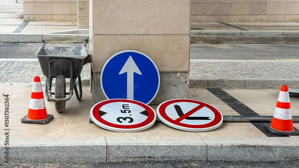 Urban symphony of abandoned signs and cones, symbolizing roadside zen, driving meditation, and Infrastructure Week contemplation