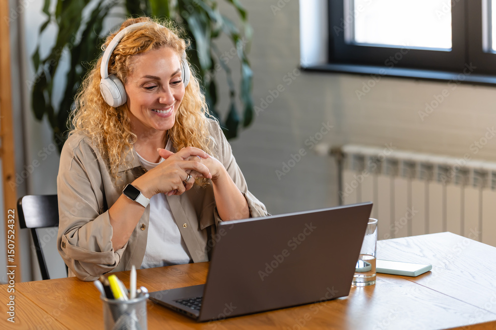 Smiling woman with headphones attentively watching a laptop screen during an online meeting, seated at a wooden desk in a cozy home office.