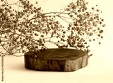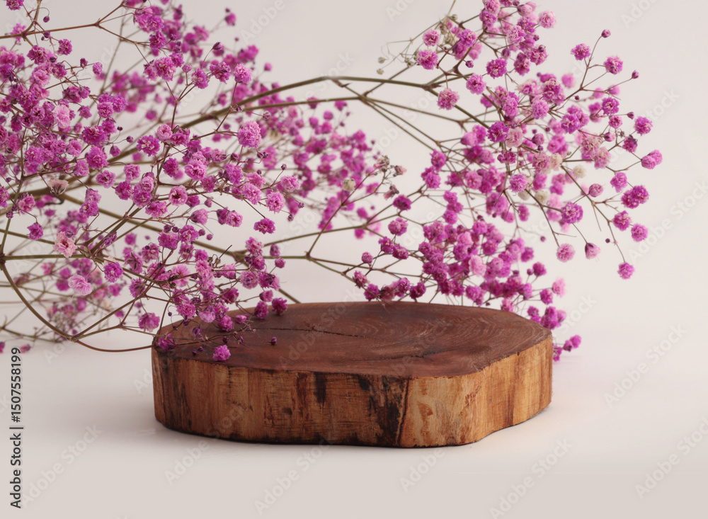 Wooden tree circle stump, platform podium plate, flower twig, on beige gray background. Minimal empty display product presentation scene.