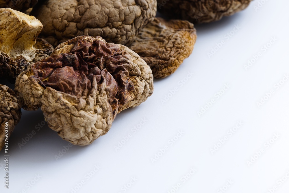 A minimalist shot of dried shiitake mushrooms on white, highlighting their textured surfaces and natural beauty.
