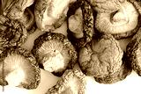Dried shiitake mushrooms arranged neatly on a white backdrop, showcasing rich textures and earthy tones.