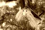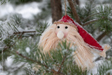 In winter, a little Santa hangs from a coniferous tree outside. Small snowflakes have fallen on Santa and the tree.