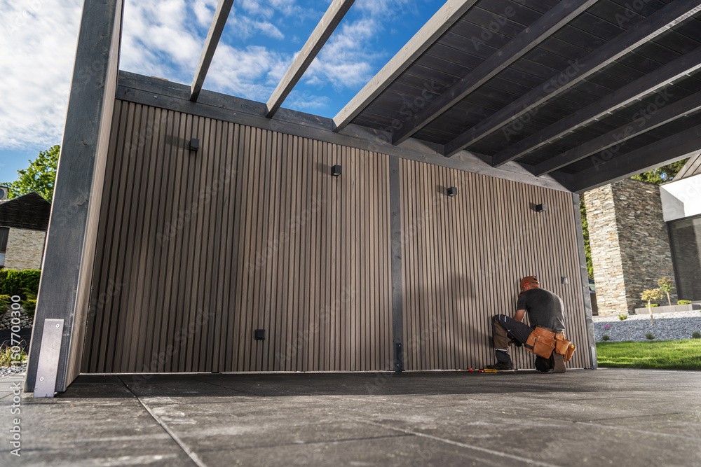 Skilled Worker Installing Lamella Wooden Paneling on Exterior Wall in Modern Home Construction