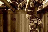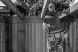 Construction Worker Repairing Wooden Beams in a Sunny Backyard During Afternoon Hours