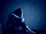 sad woman hug her knee and cry. Sad woman sitting alone in a empty room.