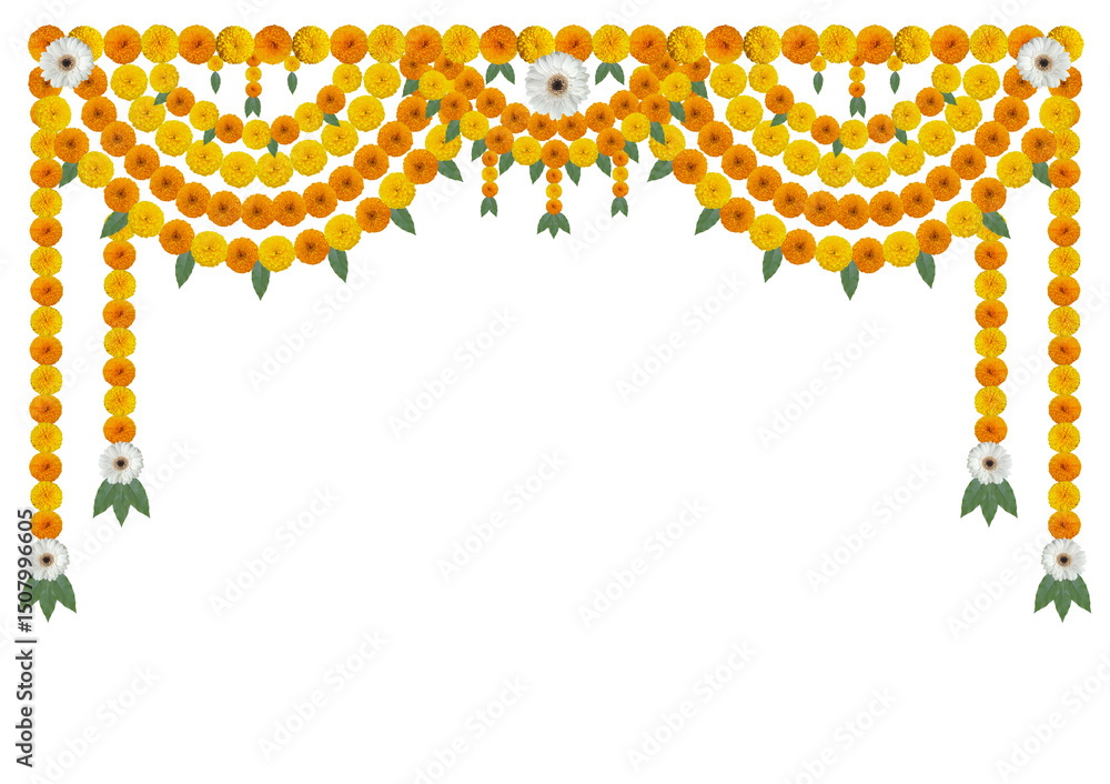 Marigold flower garland decoration backdrop for wedding decor, Happy Diwali, Indian Holiday festival background