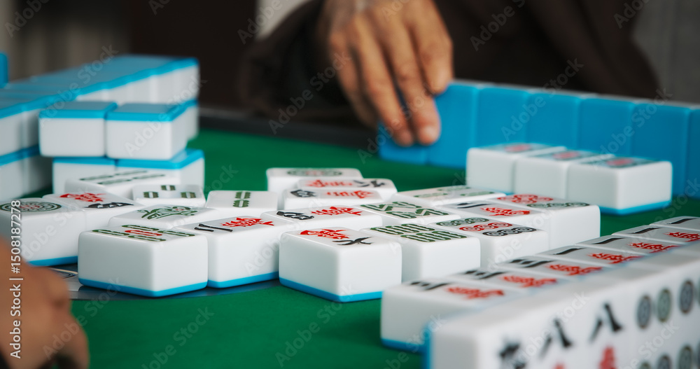 Chengdu, Sichuan, China. Men Playing Mahjong At Automatic Mahjong Table. Friendly Playing. Hands Of Mahjong Players. Asian Culture. Travel China. Chinese Tile-based Game. Live Game, Close Up View