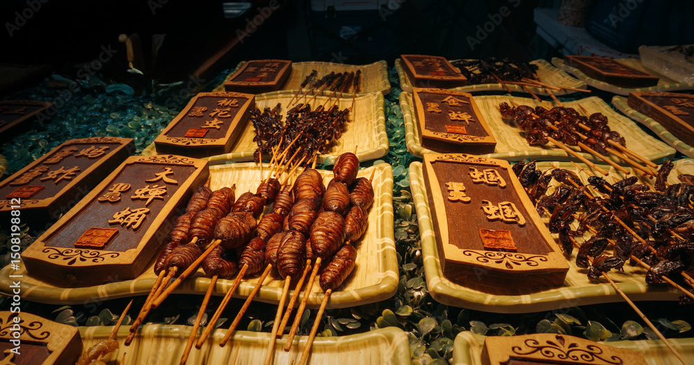 Chengdu, Sichuan, China. Insects on sticks at local Chinese market, close-up view. Various cooked insects thread on skewers. New Source Of Protein , Lipids, Minerals, And Vitamins. Fried Insects