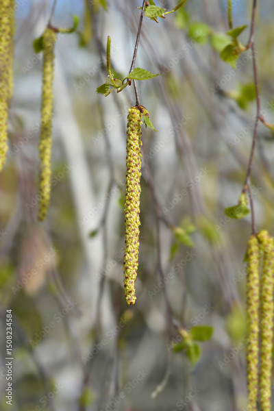 Common birch branches with new leaves and flowers - Latin name - Betula pendula
