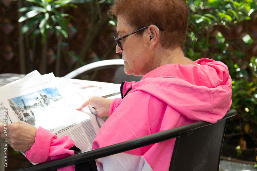 Senior woman with hearing loss and hearing aids reading newspaper on outdoor terrace