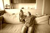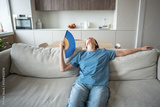 Woman lounging on sofa fanning herself in hot airless room without air conditioning. Elderly discomfort from sweltering, heatwave vulnerability, poor ventilation struggle, aging female hardship