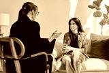 Young woman patient at mental therapy session, talking with psychologist