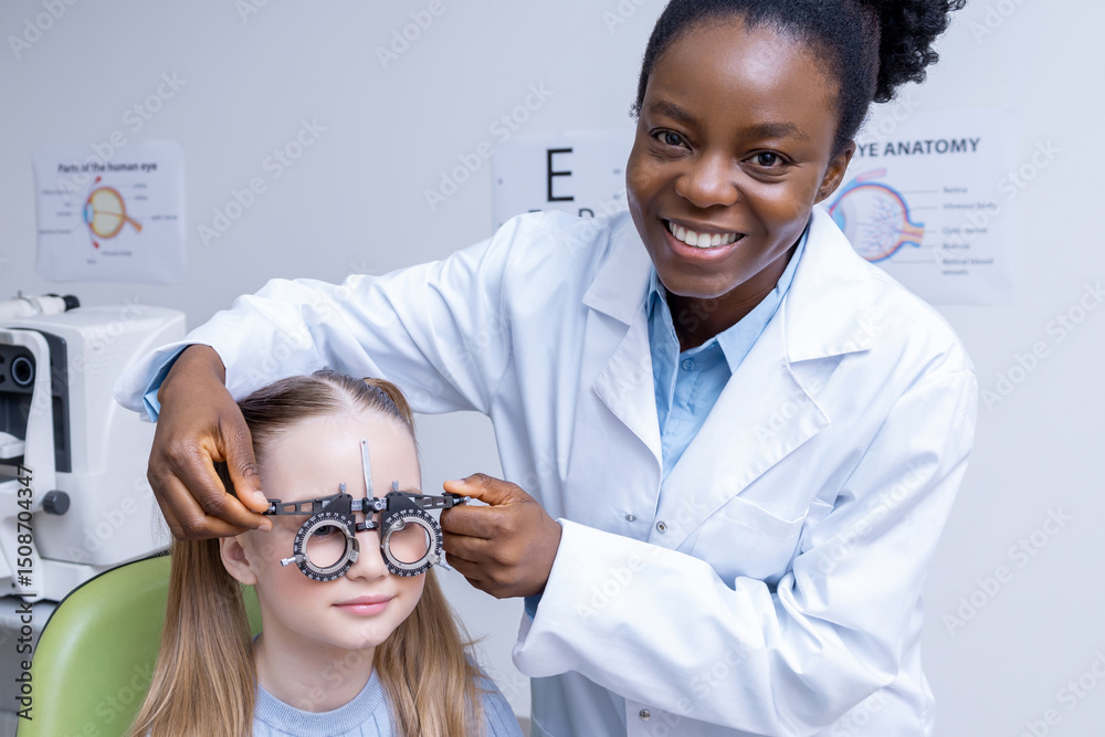 African american female optometrist checking vision of a small patient