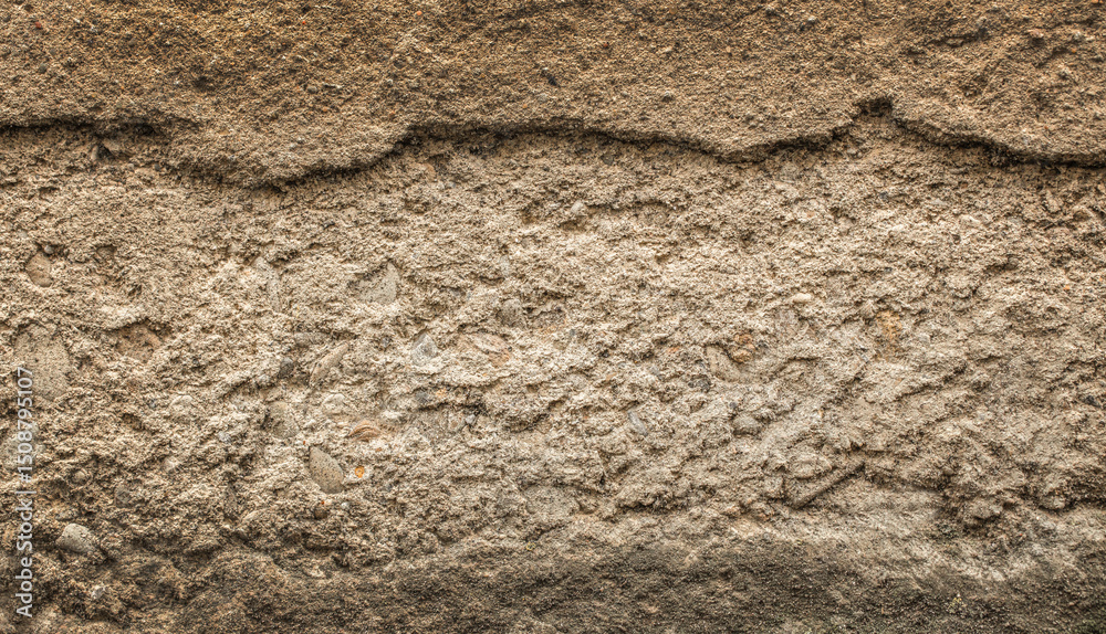 Rough textured earth wall surface showing layers of soil and sediment for background