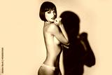 Sensual portrait of a young nude sexy woman. Sexy model posing in studio shadow lighting. Fashion shoot of beauty woman. Sexy model with fashion makeup. Sexy brunette woman.