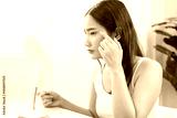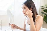 Puberty concept, worry asian young woman, stressed looking in mirror, cute girl allergy presenting allergic reaction from cosmetic on face. Beauty, health care from acne problem, dry skin, treatment.