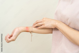 Dermatology asian young woman, girl allergy, allergic reaction dermatitis from wrist bracelet, jewelry on arm, hand in scratching itchy, itch red spot or rash of skin. Healthcare treatment beauty