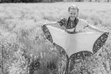 Pretty young girl in yellow dress with traditional Russian pattern standing smiling in vibrant field of flowers on sunny summer day, embracing joy and beauty of childhood in nature landscape.