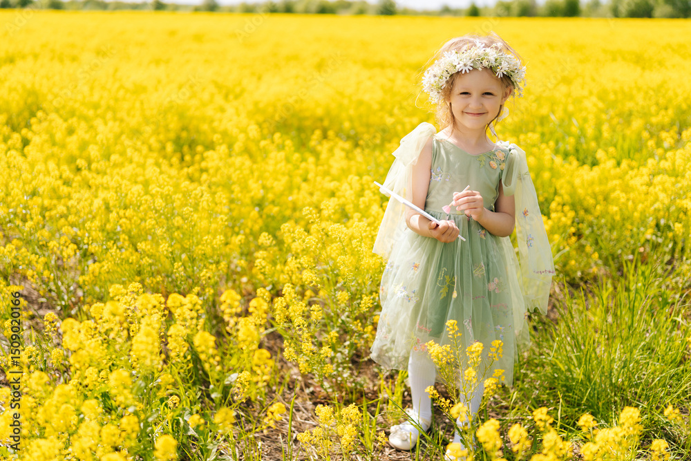 Happy child wearing flower wreath and fairy costume standing posing at green field during sunny summer day, drawing on white canvas, enjoying beautiful nature. Concept of happiness childhood.