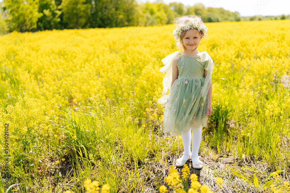 Cute preschooler girl in festive dress and flower crown, enjoying beautiful sunny summer day while playing in vibrant yellow meadow filled with blooming flowers. Concept of happy childhood.