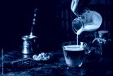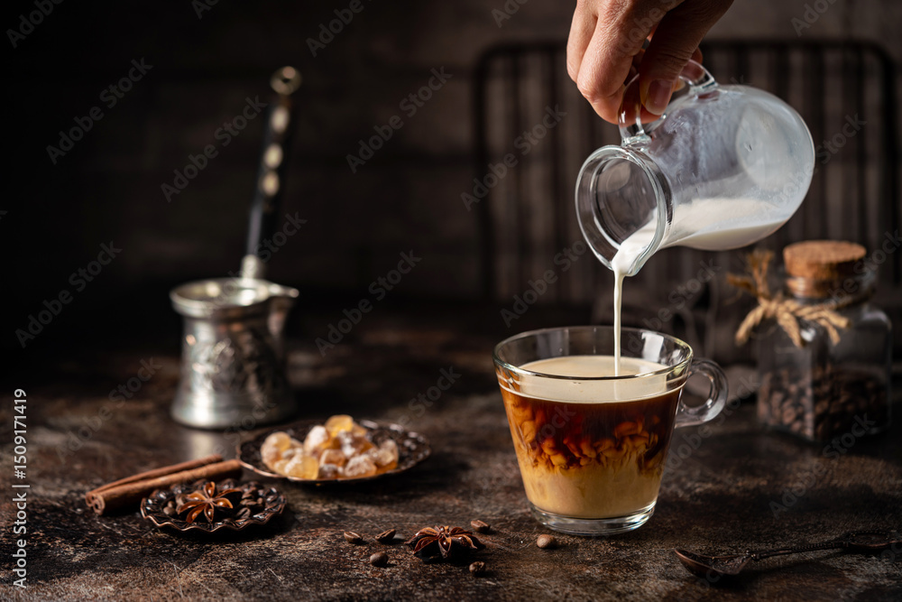 Coffee in a glass with cream poured over, sugar and coffee beans on dark background