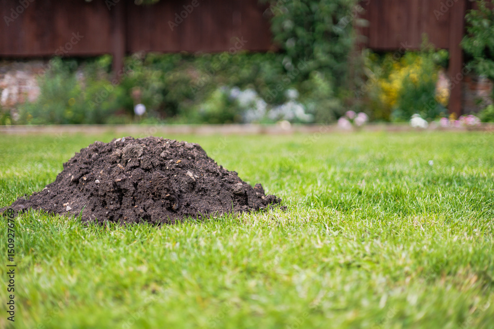 A fresh molehill on a green lawn, showing soil pushed up from underground tunneling—common evidence of mole activity in gardens and yards